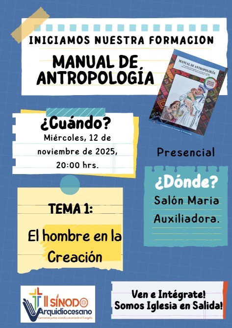 El Centro Parroquial de Formación ha anunciado las próximas fechas para las jornadas formativas de los talleres de Sinodalidad, basados en el libro «Manual de Antropología», propuesto por la Arquidiócesis de Guatemala.