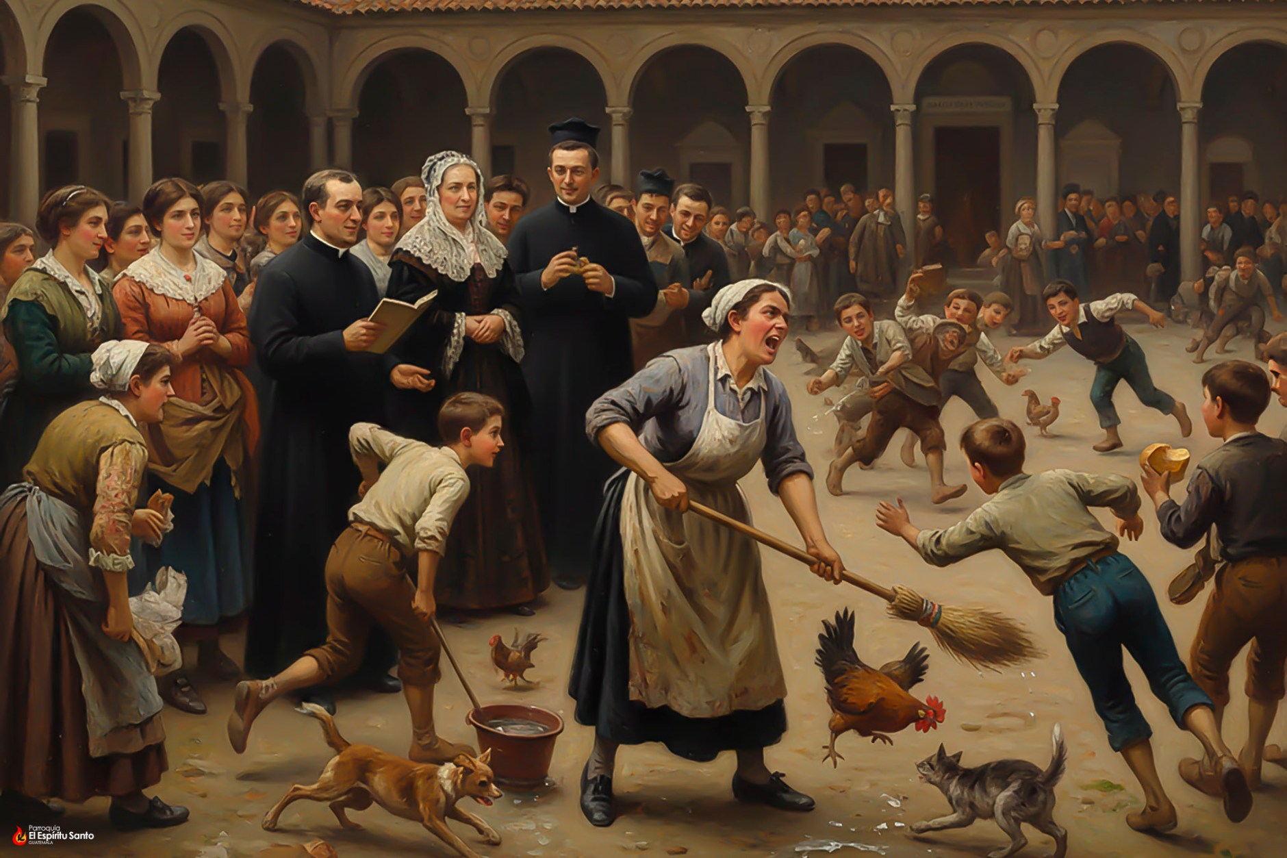 El 25 de mayo de 1845 los muchachos abarrotan la Misa, luego cogen al vuelo el panecillo del desayuno y se desparraman ruidosamente por el patio y bajo los pórticos. La sirvienta del capellán, que bajo aquellos pórticos cría un gallinero, se siente trastornada y monta en cólera. Se pone a gritar, a correr, a mover el mango de la escoba, mientras las gallinas, asustadas, huyen perseguidas por los muchachos.