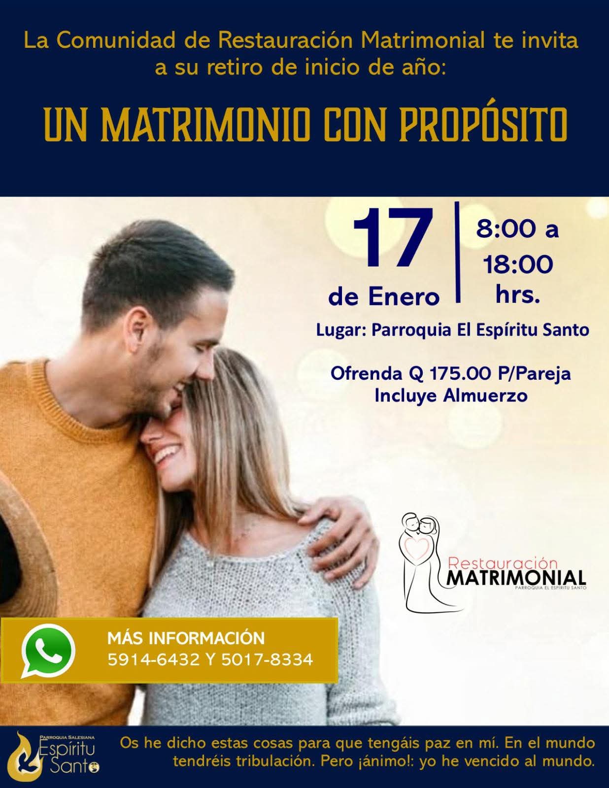 Con el deseo de iniciar el año fortaleciendo el amor, el diálogo y la fe en la vida conyugal, el Grupo de Restauración Matrimonial invita cordialmente a los matrimonios a participar en su retiro de inicio de año titulado «Un Matrimonio con Propósito».