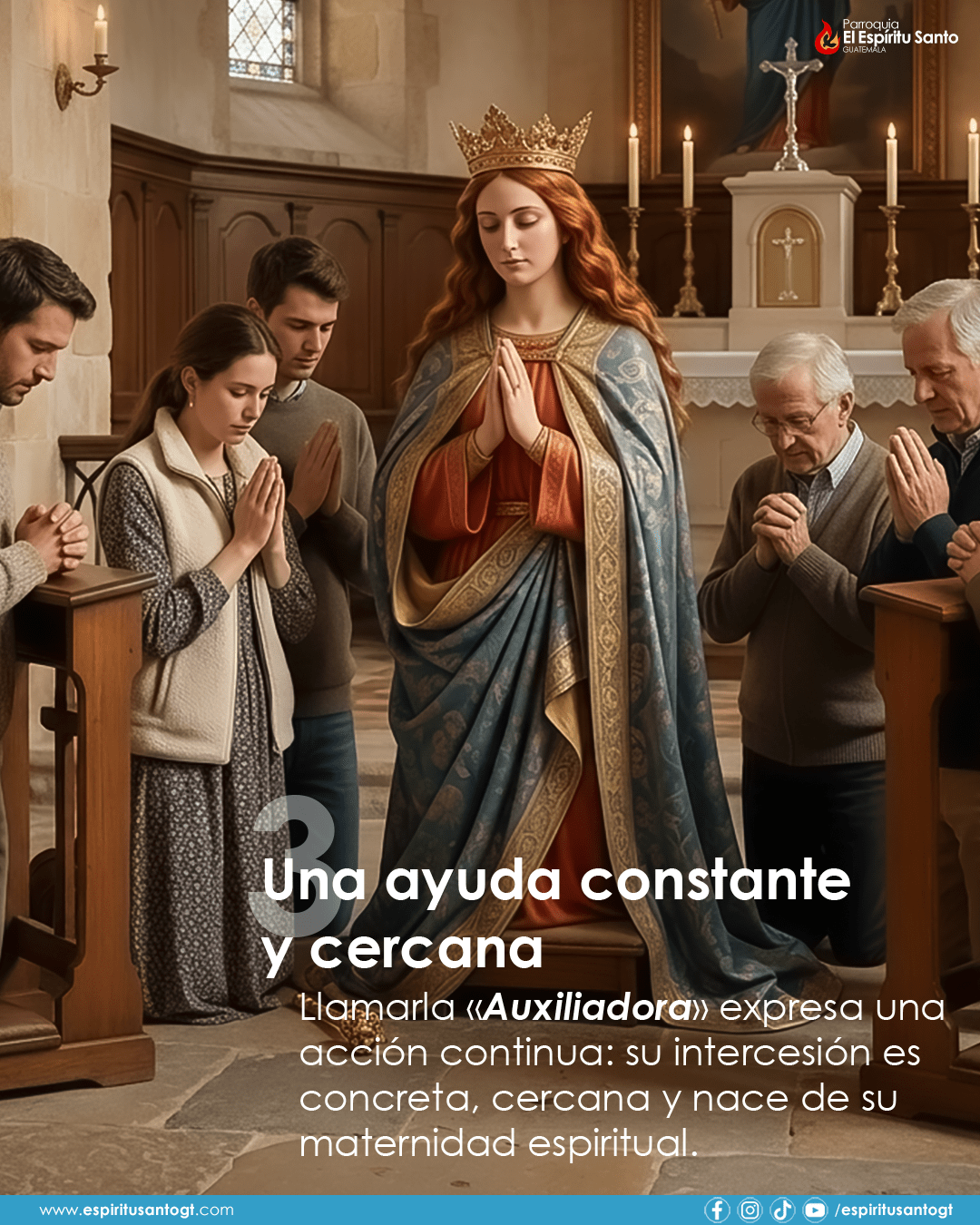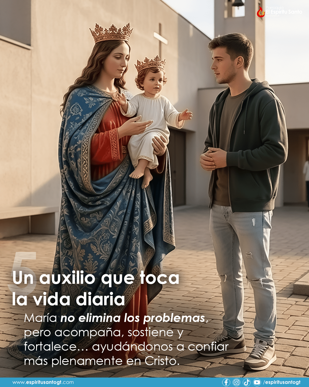 No se trata de una solución mágica, sino de una presencia maternal que sostiene, orienta y acompaña. Como toda madre, María no elimina las dificultades, pero no deja solos a sus hijos en medio de ellas. Su auxilio no sustituye nuestra relación con Dios, sino que la hace más cercana, más confiada y más viva.
