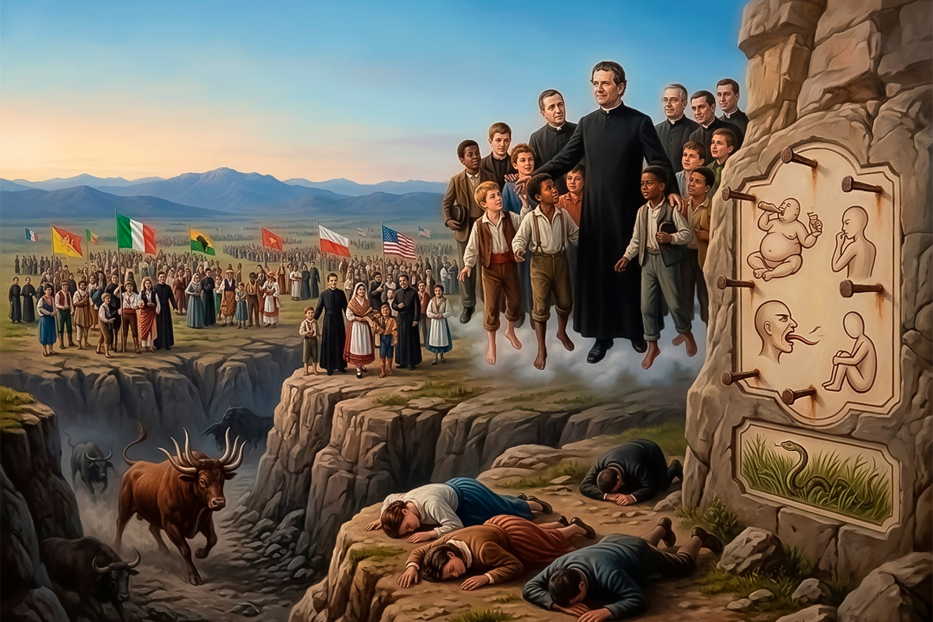 Y aparecieron allí personas de todos los colores y razas y con vestimentas de los más diversos países de la tierra. Allí cerca de mí había salesianos que conducían enormes grupos de muchachos italianos. Los logré reconocer. Luego hacia el sur vi muchos salesianos de Sicilia y del África dirigiendo grandes multitudes de jóvenes. Miré hacia el oriente y vi muchos jóvenes de Asia conducidos por los salesianos. A los salesianos de la primera fila los conocía. Los demás me eran desconocidos. Miré hacia el norte y hacia el occidente y por todos lados, enormes grupos de muchachos marchaban dirigidos por los salesianos.