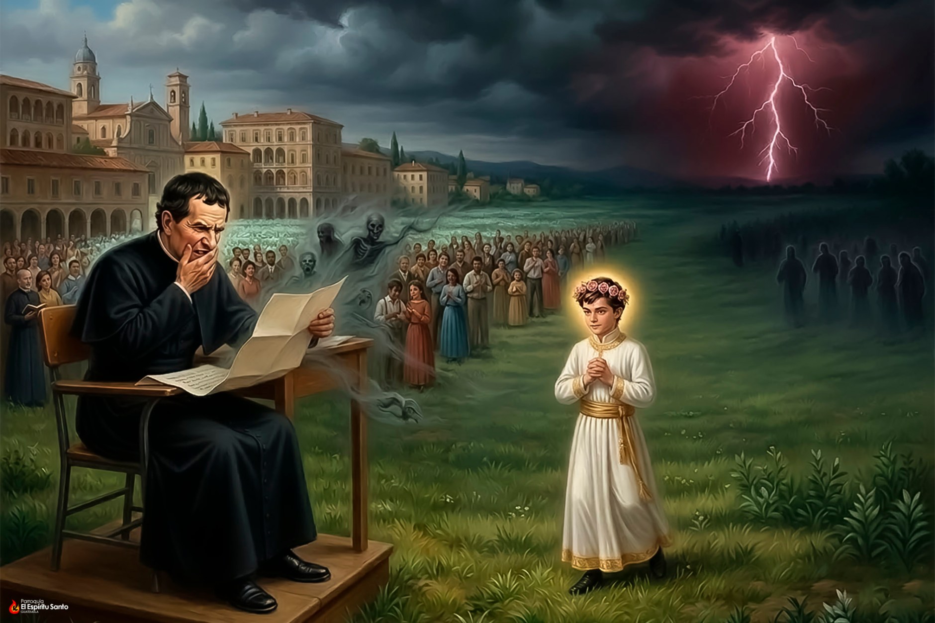 Luego de contemplar todos aquellos numerosos grupos de jóvenes que seguían a Domingo Savio le pregunté: «¿Quiénes son esos que te siguen?». Y un coro de jovencitos me respondió cantando: «Son como los ángeles de Dios en el cielo» (Mt. 22, 30). Volví a preguntar a Domingo: «¿Por qué tú, si no eres el más viejo, eres el que viene dirigiendo este grupo?». Él me respondió: «Es que yo soy el más antiguo de los que han muerto en el Oratorio, porque fui el primero de tus alumnos en pasar a la otra vida. Y además traigo un mensaje de Dios».